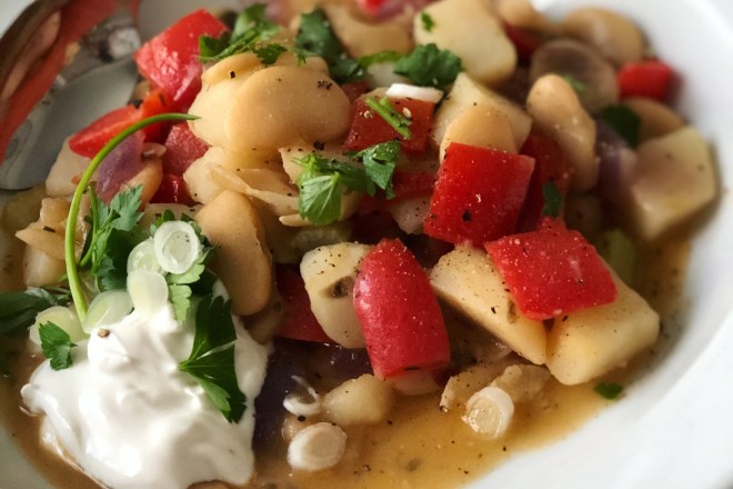 Add the drained butter beans and the rest of the salt and stir. Cover the pot, reduce the heat to medium low, and let this gently simmer for about 15 minutes. The potatoes should be fork tender and it should be a stew or thick soup consistency. If it’s too thin, keep simmering uncovered…too thick? Add a little more stock.