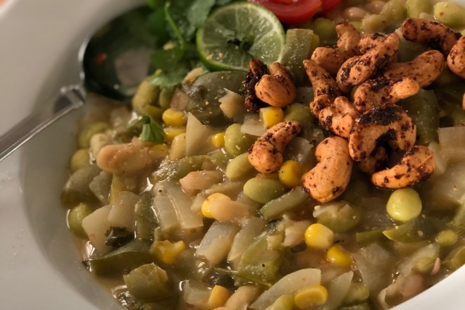 Pour in vegetable stock and stir. Turn up heat and bring just to a boil. Then lower heat to a slow, bubbling simmer – probably medium low heat. Simmer uncovered for 30 minutes. Stirring occasionally. The tomatillos will break down toward the end of the simmer time and the chili will thicken. Stir in lime juice and chopped cilantro to finish before serving.